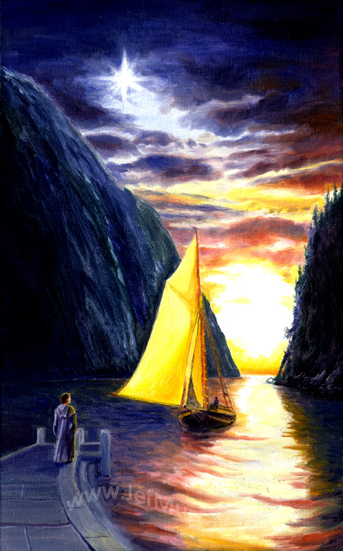 Artist Commentary: I spent Saturday at Mithlond on the Gulf of Lune. The skies beyond the sentinel cliffs were stormy, but the cadmiums and crimsons of the setting sun streamed through the breach. Emblazoned in the light, an elven sloop rode roiling waves as she approached the ancient havens. And high above, Eärendil sailed the skies; His crystalline light pierced scudding clouds as evening fell….